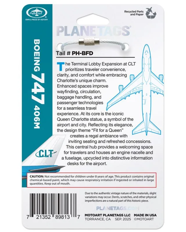The Queen of the Skies has landed in Charlotte. MotoArt is proud to present limited-edition PlaneTags made from KLM’s Boeing 747 PH-BFD, a legendary aircraft that once connected continents and now lives on as part of Charlotte Douglas International Airport’s aviation-themed terminal expansion.