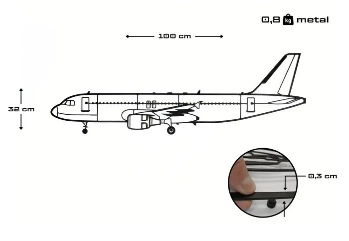 Eine Wanddekoration für Reise- und Luftfahrtliebhaber Unsere lasergeschnittene Airbus A320-Silhouette aus 3 mm starkem Stahl mit versteckten Befestigungspunkten bringt modernen Luftfahrtstil in Ihr Interieur.