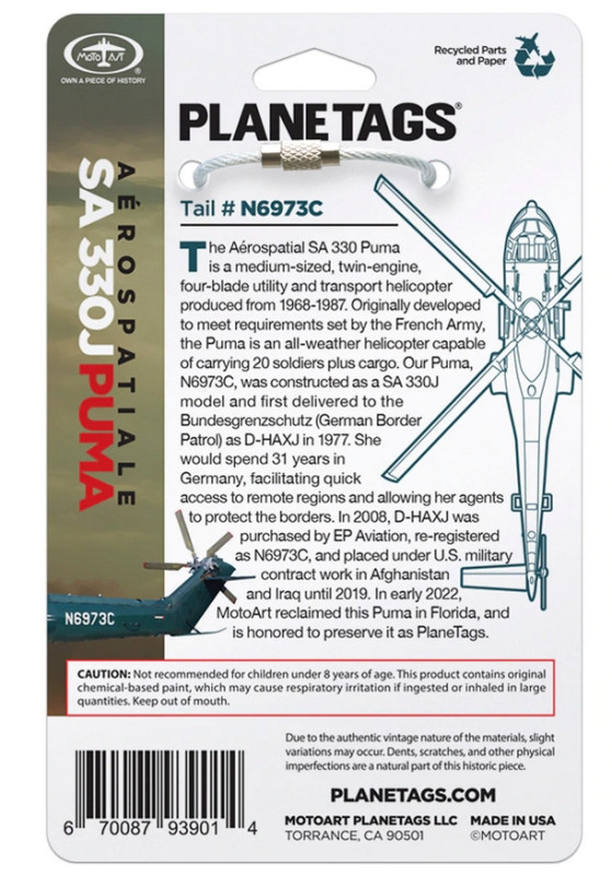PlaneTags werden aus einem ausgemusterten Flugzeugrumpf hergestellt, nicht nur aus gestanztem Metall. Da PlaneTags aus echtem Flugzeugrumpf hergestellt werden, trägt jeder PlaneTag die Farbe, Dicke und Abnutzung des Rumpfteils, aus dem er geschnitten wurde, und es ist daher selten, zwei identische PlaneTags herzustellen. Diese Abweichungen und Unvollkommenheiten sind keine Produktmängel. Sie sind Teil der Schönheit von PlaneTags. Aus diesem Grund haben Sie keine Möglichkeit, die Farbe Ihres PlaneTags zu wählen. Die Bilder auf dieser Website dienen nur als Referenz und sollten nicht als alleinige Grundlage für die Wahl eines bestimmten PlaneTag verwendet werden.
